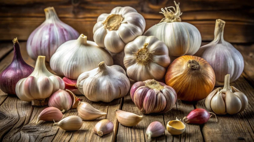 Uma imagem de vários bulbos de alho fresco, de diferentes tamanhos e cores, dispostos em uma cesta de vime sobre um fundo neutro, sem qualquer texto ou marcas visíveis.